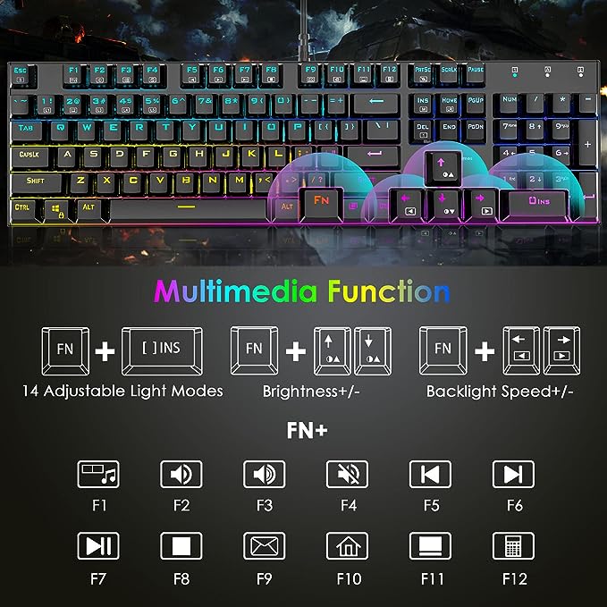 - Gaming keyboard – Special keys are designed to access the Internet, music, and other frequently used programs. With the game mode and button custom settings, you can freely switch 5 game modes to improve entertainment. You can also lock the windows with FN + WIN, and adjust the brightness with FN + Up/Down.